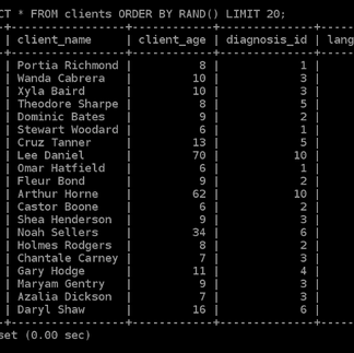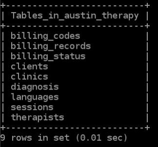 This database models the functionality of a therapy clinic and was created using MySQL hosted in an EC2 instance on Amazon Web Services. The database has 9 tables populated with 14,000+ data entries, shared between 5 locations, 35 therapists, 150 clients, 7180 sessions and 7180 generated billing records for each session.